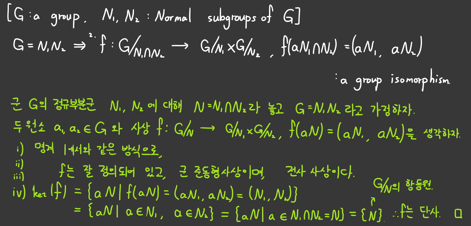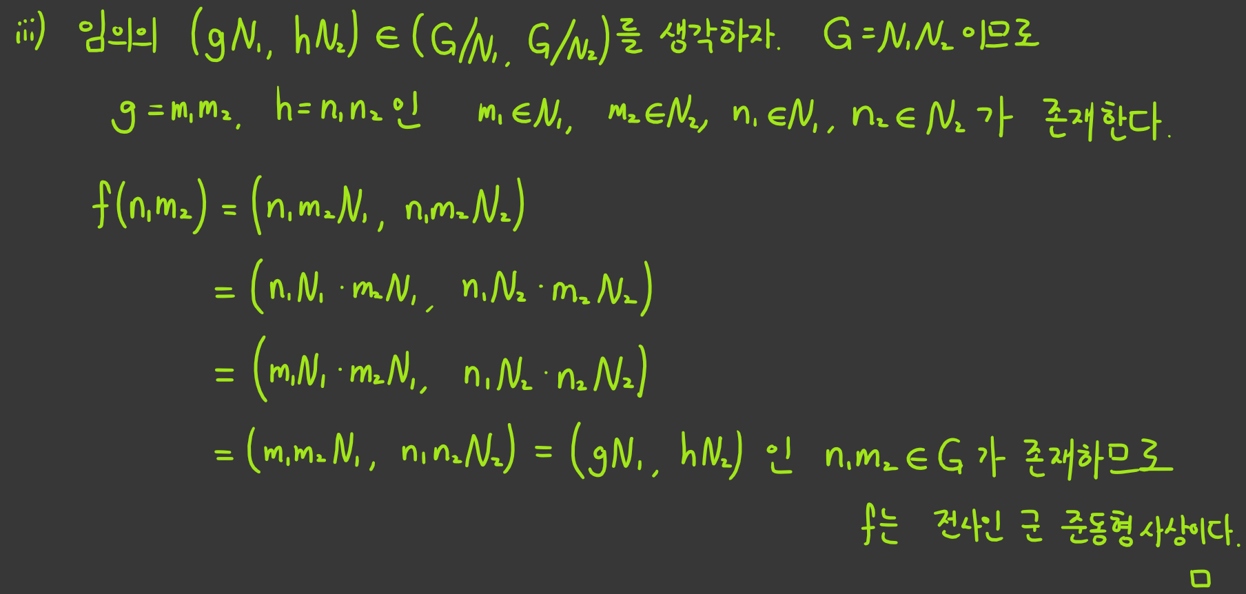 개인적으로 이 부분이 조금 끼워맞춘 느낌이 없지않아 있었는데, $n_1m_2$가 아니더라도 다양한 다른 원소로 전사 사상이라는걸 보이는게 가능할 것 같아서 계산과정이 이게 맞나 두세번은 확인했던 것 같음. 더불어 과연 이런 증명과정을 가진 명제가 실용성이 있을까에 대한 의문까지 생겼는데, 실용성은 뭐 쓸 데를 잘 찾으면 되는거니까 'v'